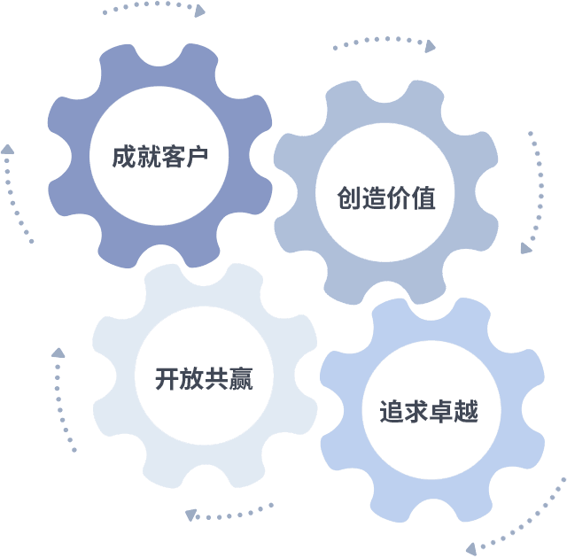 成就客户是一切决策的出发点,,创造价值是衡量所有工作的标准,,,,追求卓越是我们做事做人的态度,,开放共赢是我们的格局也是最终的结果。。。。价值观的齿轮环环相扣,,推动着组织里的每个人不断向前。。
