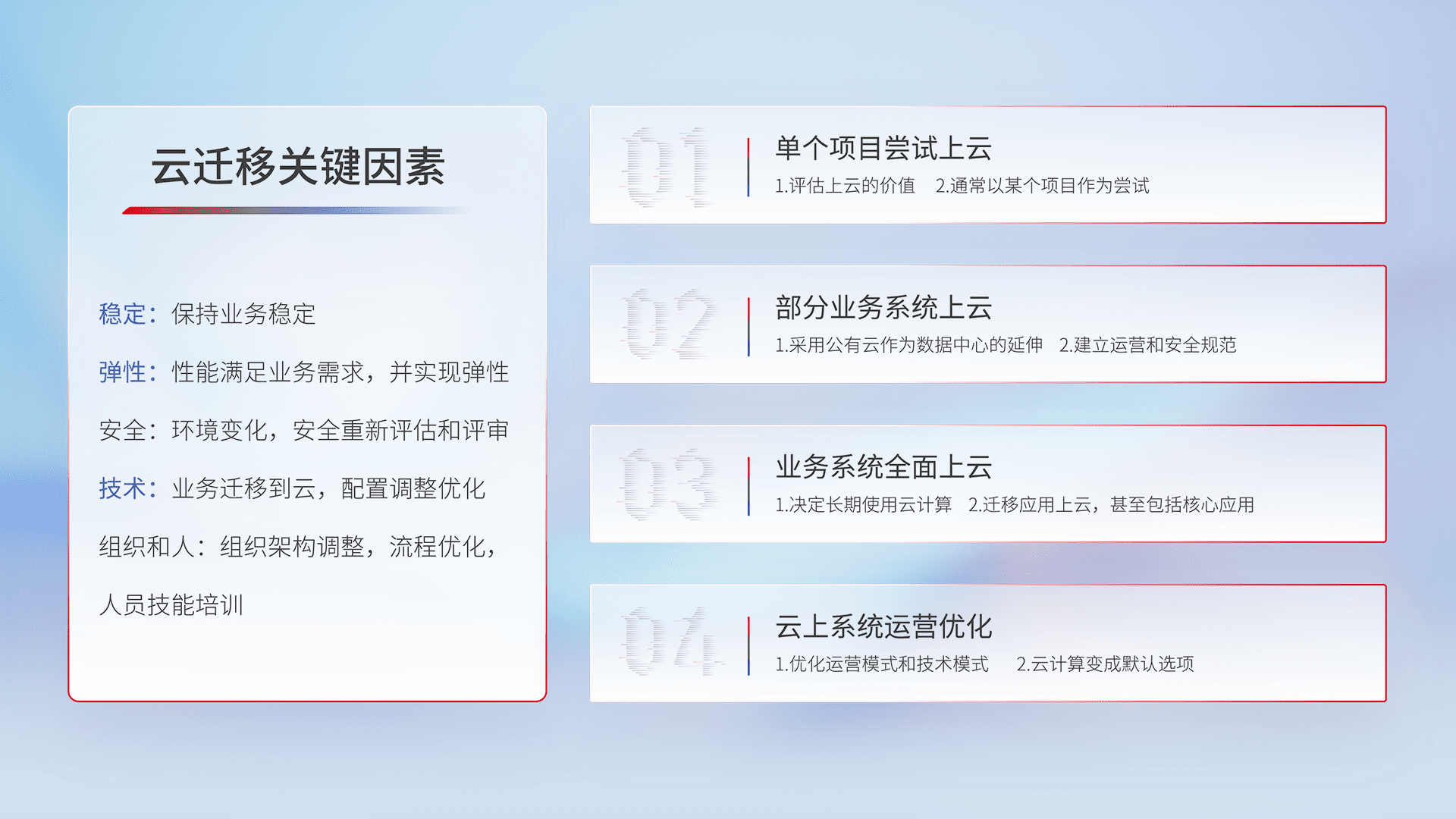 结合实际业务,,,从规划设计、、、、云平台选型、、云原生改造、、、数据迁移、、、集成交付,,,,迁移全过程为客户识别最佳上云路径,,,做好风险识别管理,,设计网络架构、、、身份权限、、安全审计合规、、操作审计、、日志审计、、、监控告警策略、、、、多站点容灾设计等,,对云上基础设施进行整体规划,,,,提升IT治理水平,,,以满足弹性、、、、高可用、、高性能的需求。。。。