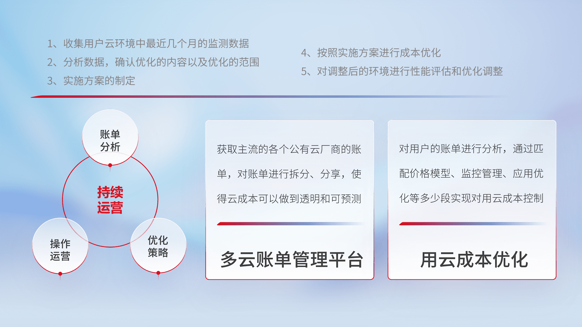 通过多云纳管,,,以统一的资源数据模型把客户的云资源进行抽象和封装,,,进而实现对多云资源的统一操作,,保障云资源管理的可靠性、、、稳定性与可用性。。量身定制化运维内容,,,,配置、、、、开发运维、、、补丁管理、、备份、、监控、、、认证和访问管理、、、审计和日常巡检等,,,保障在用云过程中的可靠度,,,稳定度以及高可用率。。。